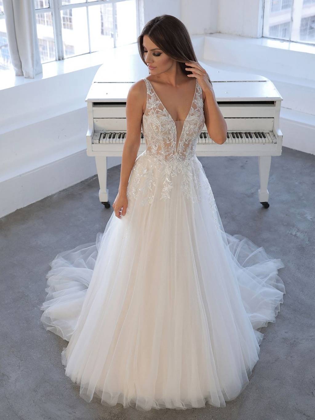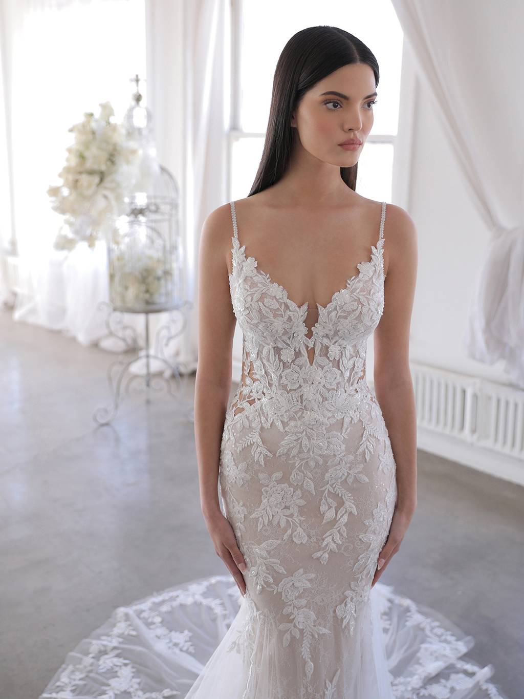 Angelic & divine… Meet our Pierce. This figure-enhancing wedding gown features a beaded cotton lace all over with sexy illusion straps and an unforgettable plunging neckline. Not only does this lacy goddess feature sparkling tulle, but she also includes striking side panels for added glamour.