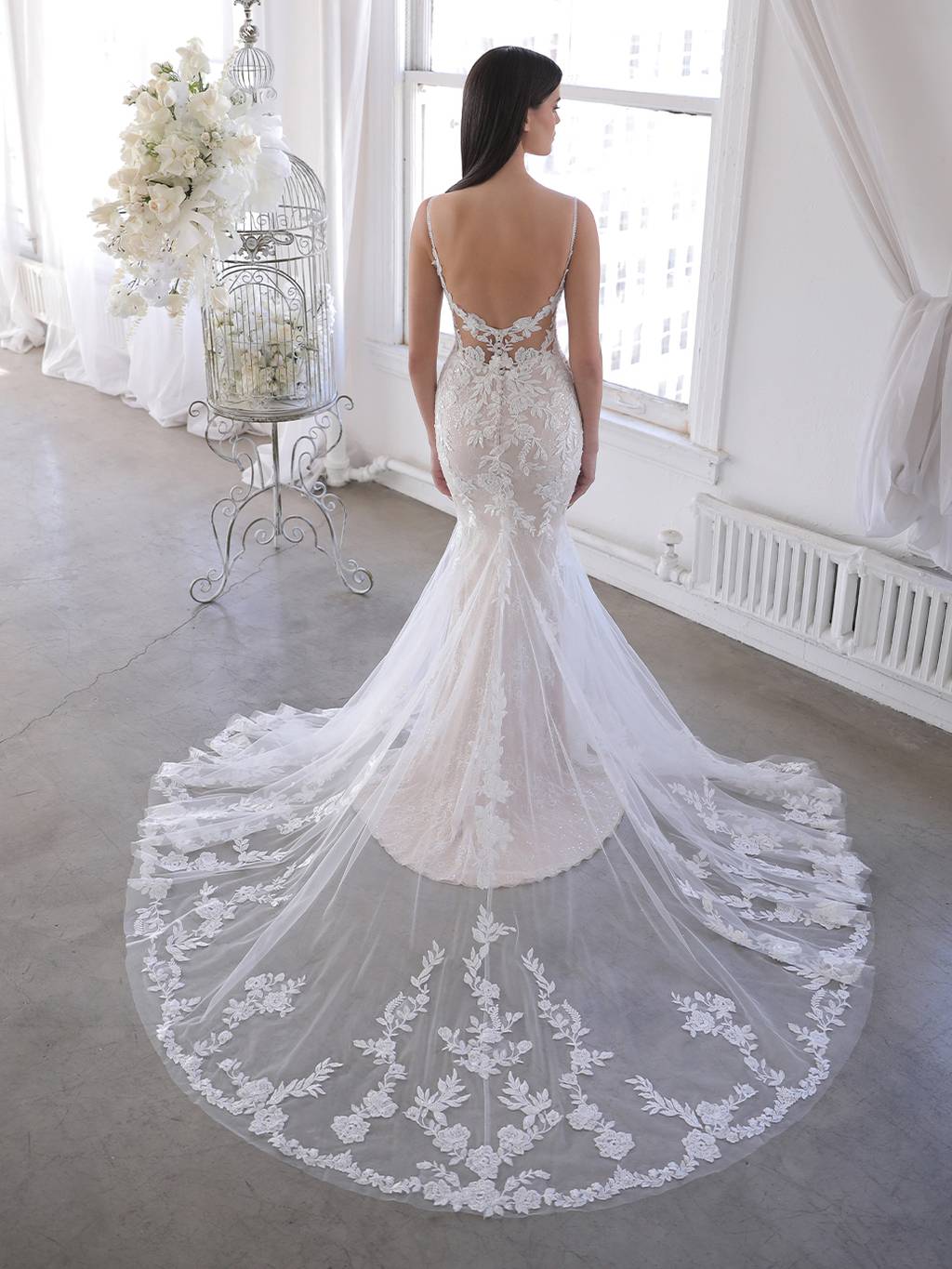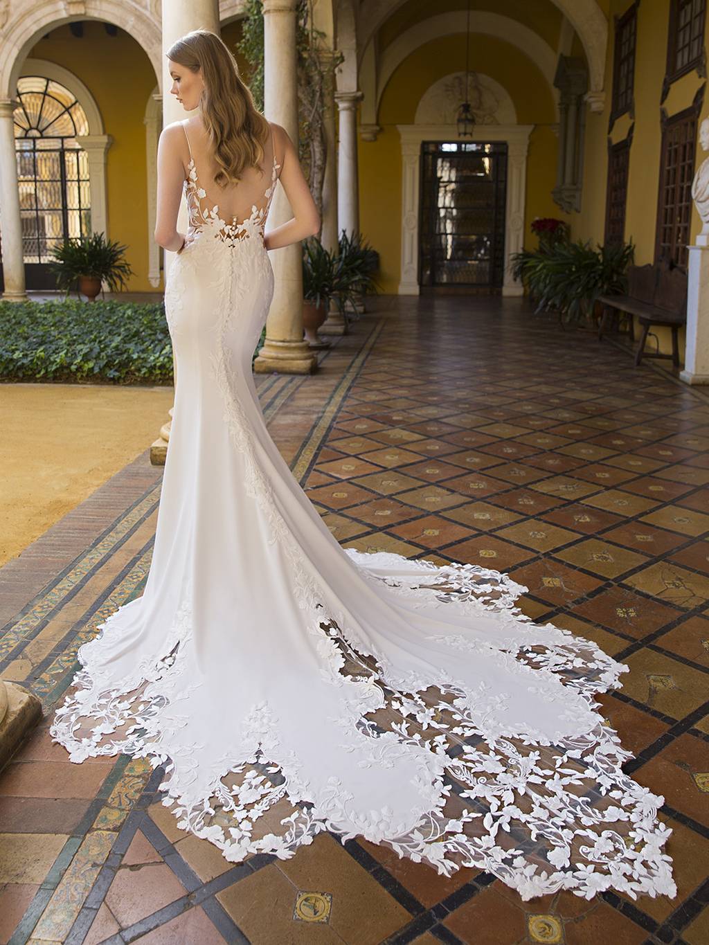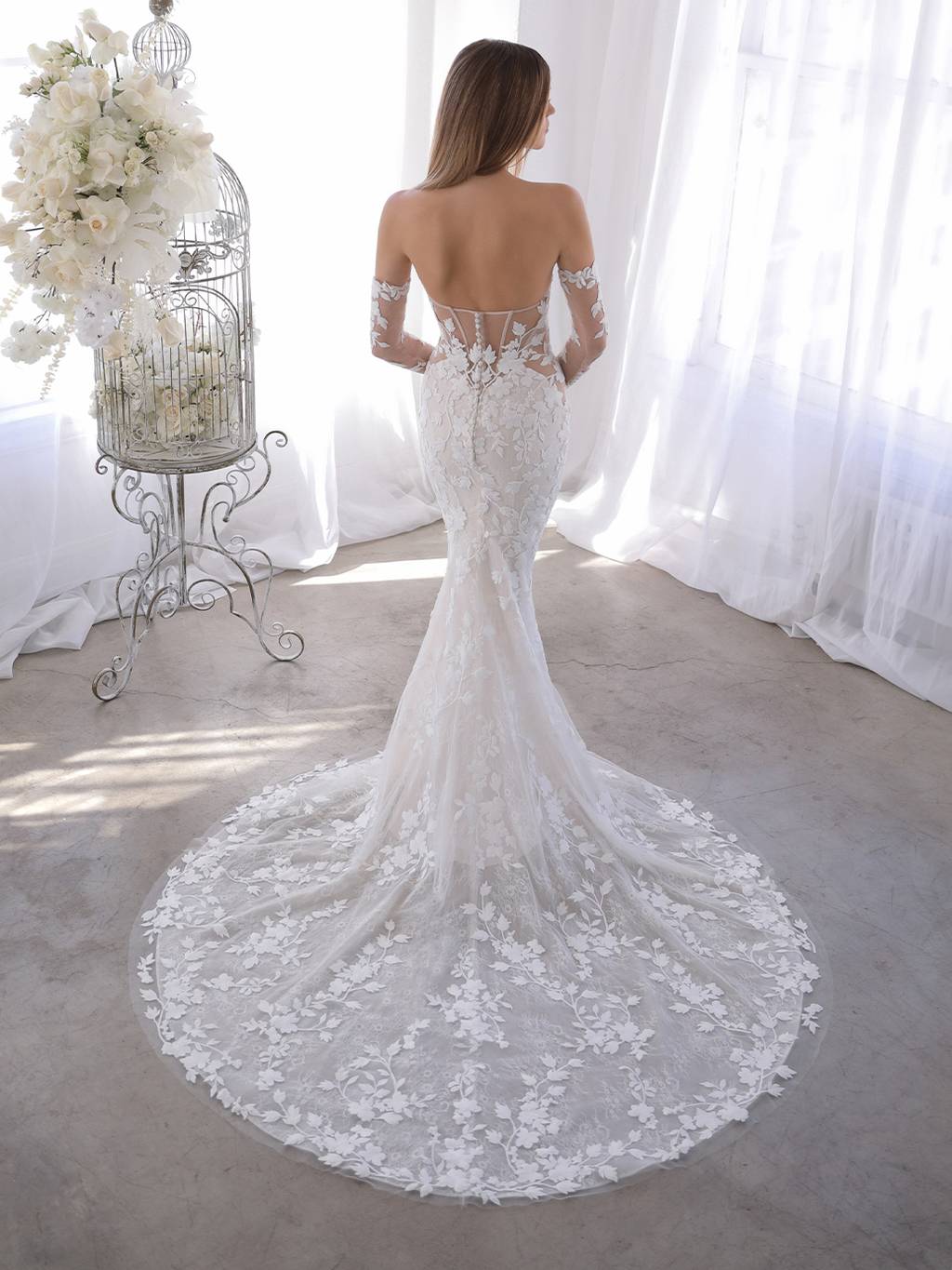 Like a gorgeous upgrade on our beloved Lesley gown. The intricate custom-made thick cotton embroidered floral motifs are the center of this curve-hugging mermaid gown as they cover every inch. And it stands out even more with figure-enhancing side panels and a plunging illusion sweetheart neckline bodice with sweet spaghetti straps. The illusion embellished back is sure to keep all eyes on the bride, especially with the lace appliques beautifully cascading down the lavish skirt, featuring a signature Enzoani scalloped lace train.