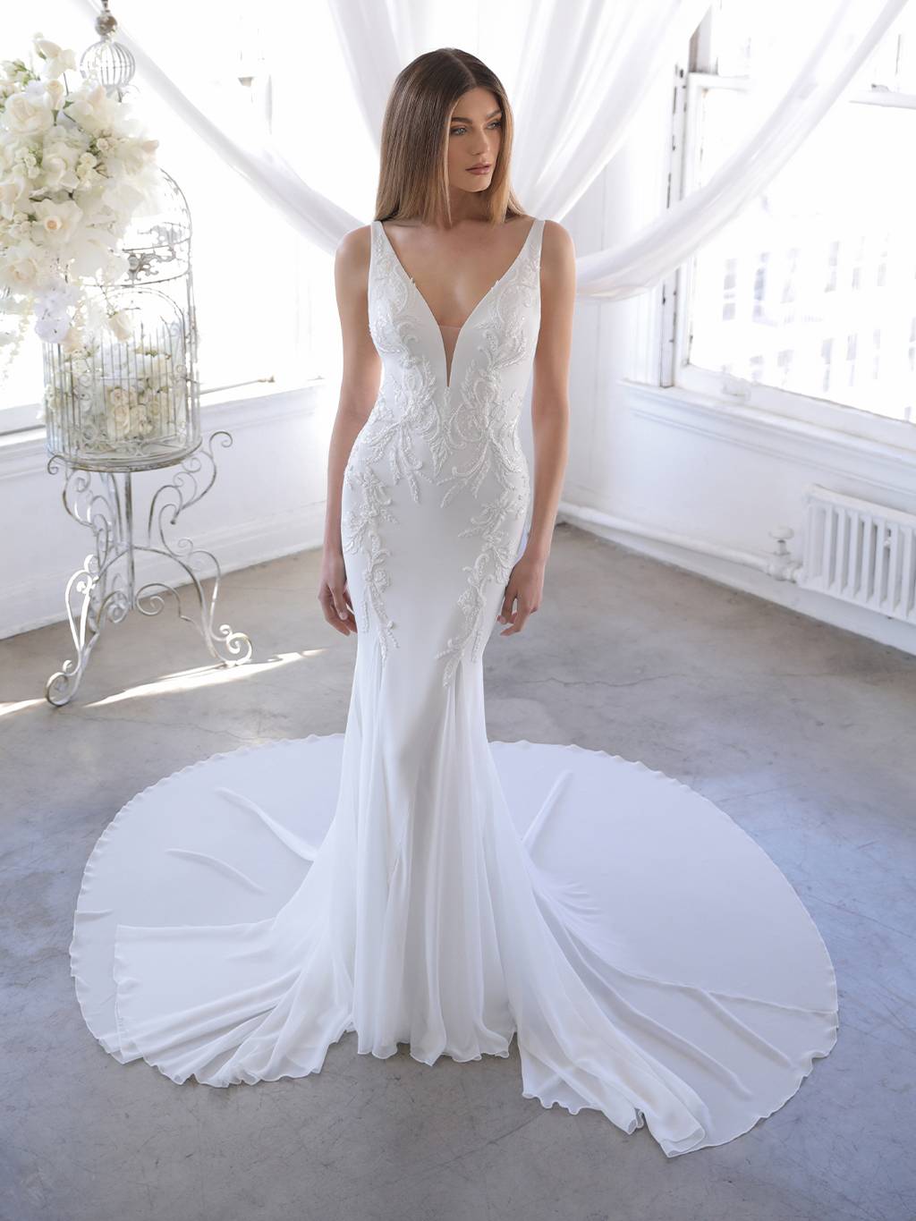 This mermaid gown is all about clean lines and sleek sophistication with a twist – elegant embroidered lace beautifully trails down from the sexy plunging V-neckline and weaves throughout the illusion back for a cohesive look. The light-as-air chiffon and tulle skirt is modern and minimalist, perfect for brides who want an effortlessly glam look.