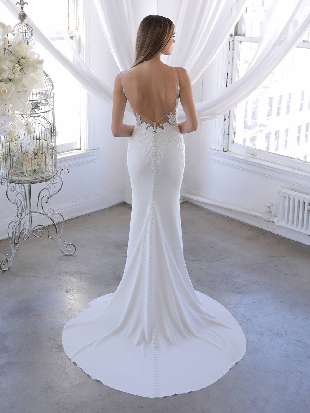Feel effortlessly beautiful and modern when you meet this elegant, sheath style wedding dress. Intricate bespoke, bold floral motif lace travels from the romantic V-plunge illusion neckline to a spectacular corset-style bodice and low illusion back down to the soft and sleek stretch georgette skirt. The gorgeous scalloped lace cut hem is sure to easily catch everyone’s attention – ideal for those heart-stopping back photos and dramatic entrances.