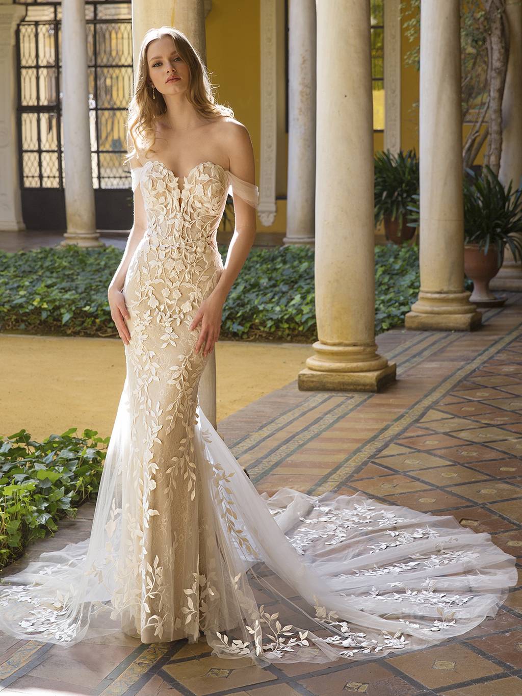 We’re having a major love affair with this iconic mermaid moment. This enchanting gown is covered in head-to-toe 3d floral embroidered lace with a seductive structured bodice and off-the-shoulder straps. The open back detail accentuates your figure while also bringing a touch of glamour with its waterfall effect train. You will assuredly be the star of the show in this Blue by Enzoani classic.