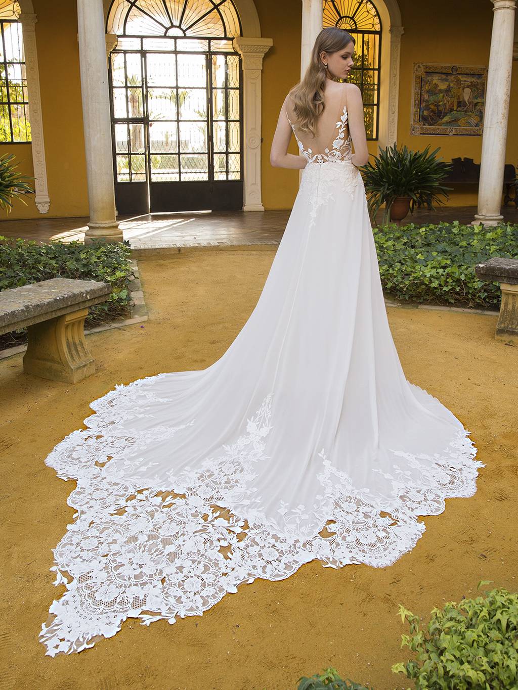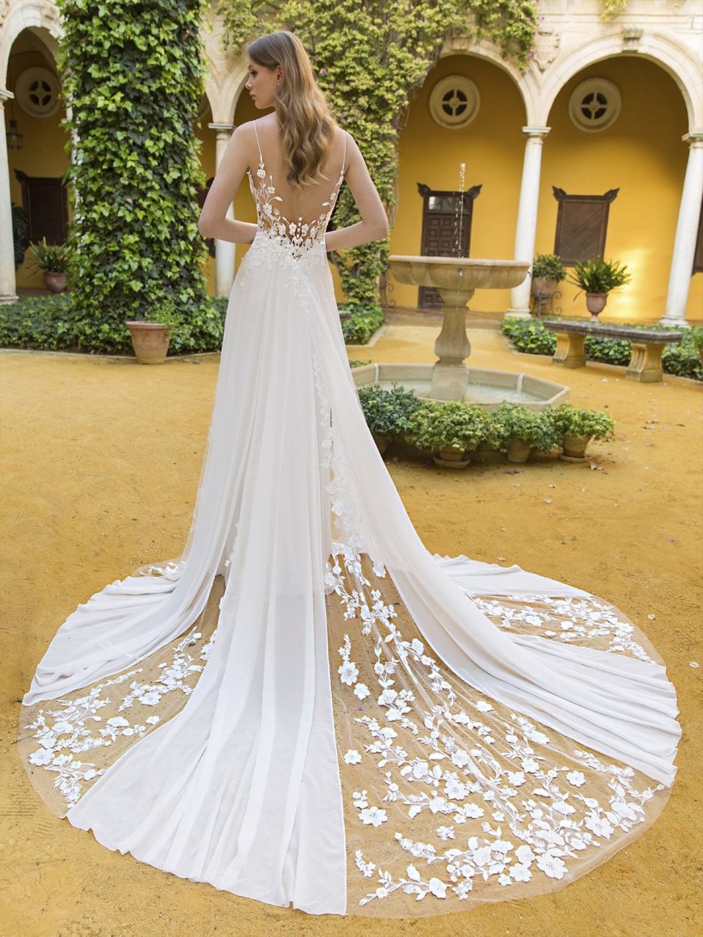A relaxed take on our beloved A-line silhouettes, Patricia features a 3D floral embroidered lace unlike any other gown. This whimsical wedding dress features a chiffon skirt that falls effortlessly, meeting an intricate and exquisite train. Don’t miss out on the delicate illusion straps that lead into a sultry plunging V-back.