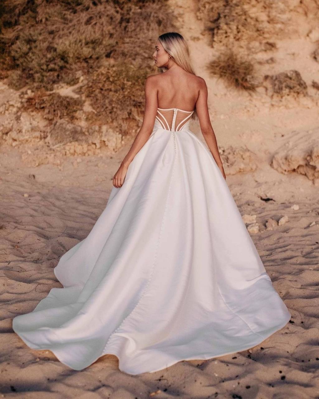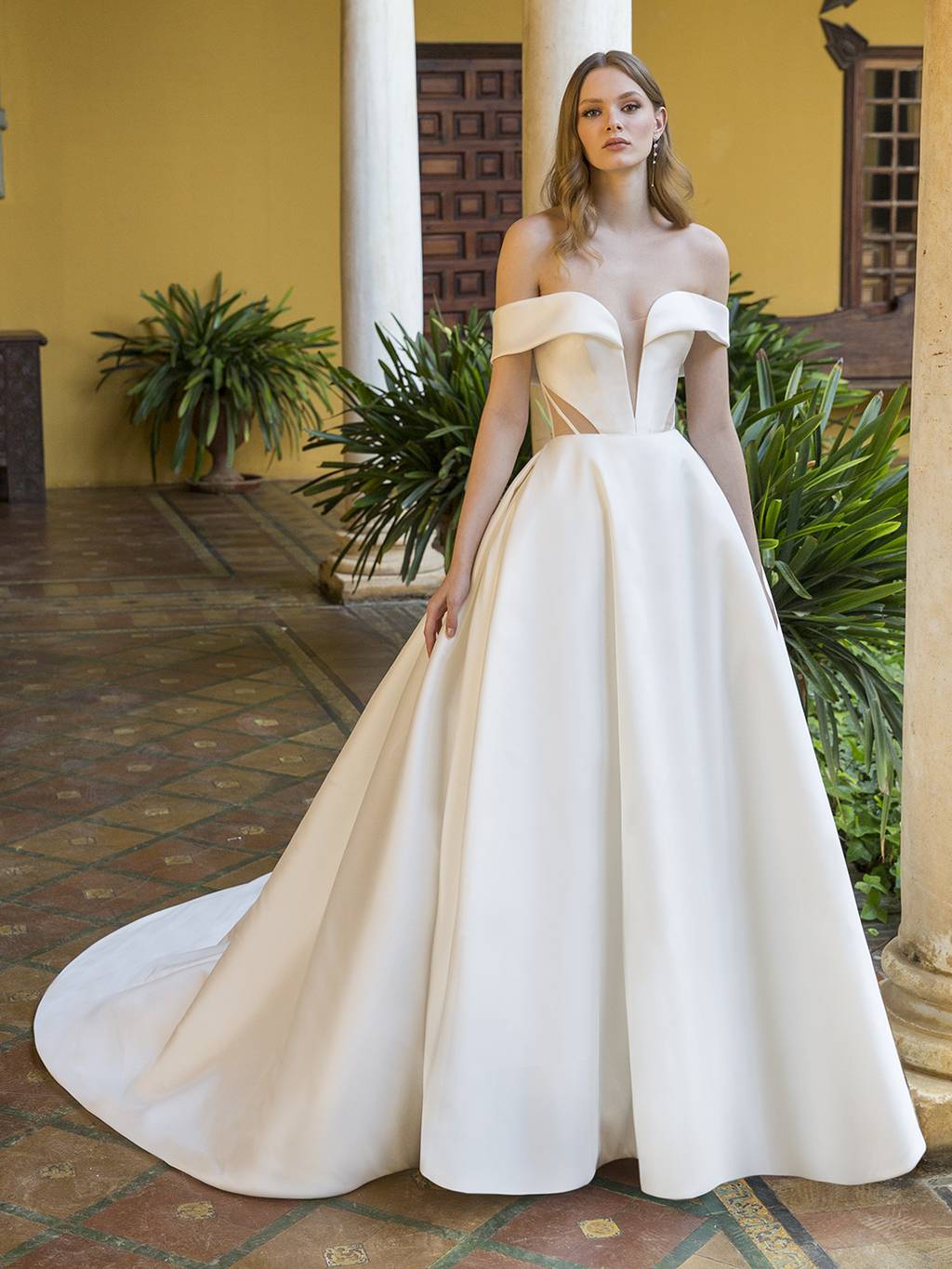 This romantic-meets-modern bridal look is a true vision. This off-the-shoulder Mikado ball gown features a V-plunge illusion sweetheart neckline, contemporary cuts with illusion sheer side panels, and unique corset-style back with gorgeously designed boning and art deco vibes. It’s meant to contour the waist and emphasize the voluminous, chic skirt. Covered buttons cascade down from the corset back to the hem of the gown for that extra sweet touch.