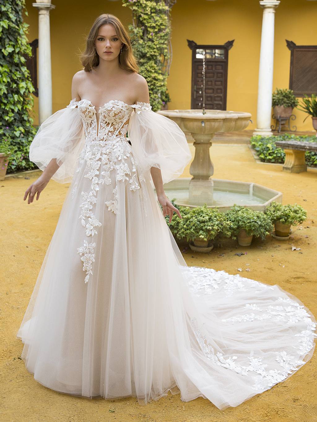Sweet and ethereal, this lavish, full A-line bridal gown features a V-plunge illusion sweetheart neckline on a gorgeous shimmer beaded lace bodice, paired with romantic, detachable sheer tulle bishop sleeves and 3D floral embroidery off-the-shoulder straps. The whimsical appliques adorning the corset-style bodice gently trickle down to the lush skirt. This gown is perfect for the modern bride who wants both exquisite detailing and unique versatility.