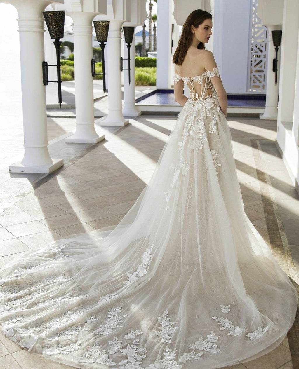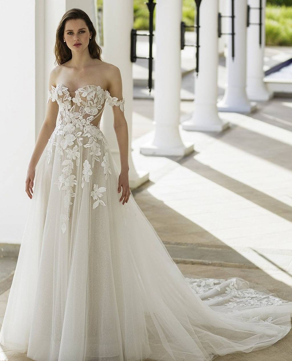 Sweet and ethereal, this lavish, full A-line bridal gown features a V-plunge illusion sweetheart neckline on a gorgeous shimmer beaded lace bodice and 3D floral embroidery off-the-shoulder straps. The whimsical appliques adorning the corset-style bodice gently trickle down to the lush skirt. This gown is perfect for the modern bride who wants both exquisite detailing and unique versatility.