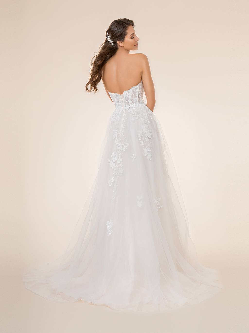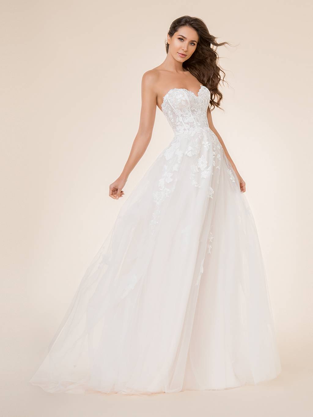 You’re sure to fall in love with the beautifully sculpted sweetheart neckline, the flowing layers of the A-line skirt, and the re-embroidered lace appliques perfectly placed throughout the dress. Sequin accents will shimmer and shine with every step you take, as the romantic sweep train glides down the aisle behind you.