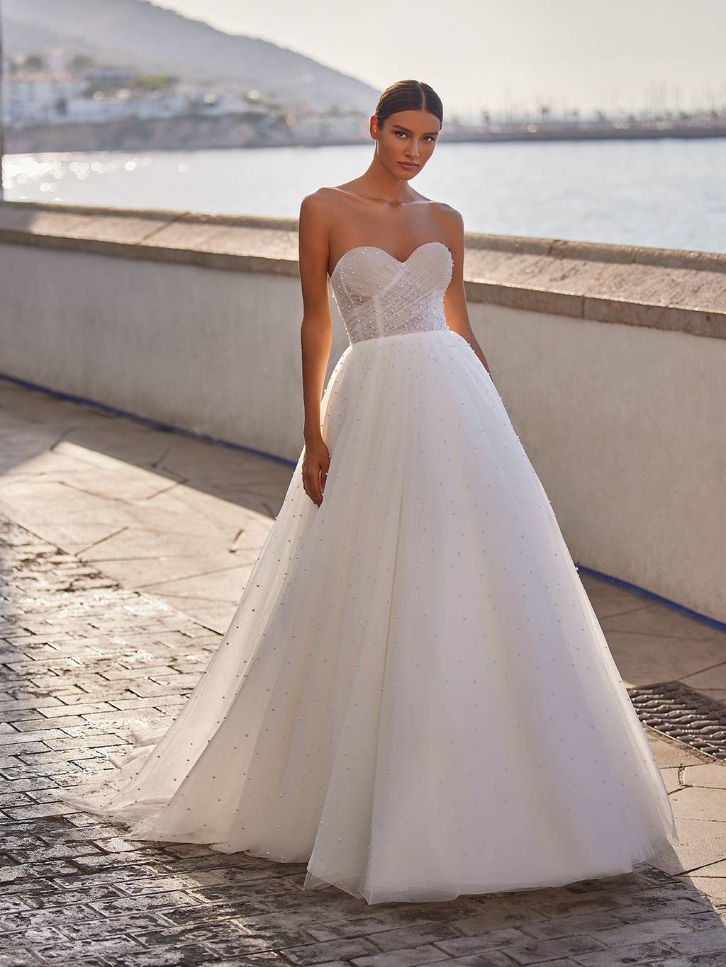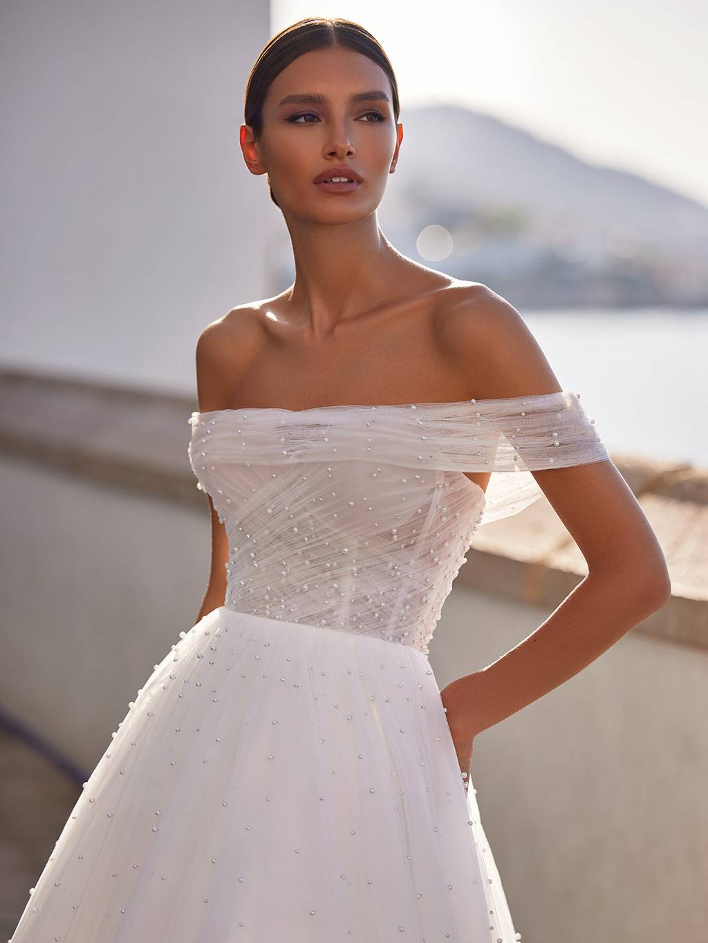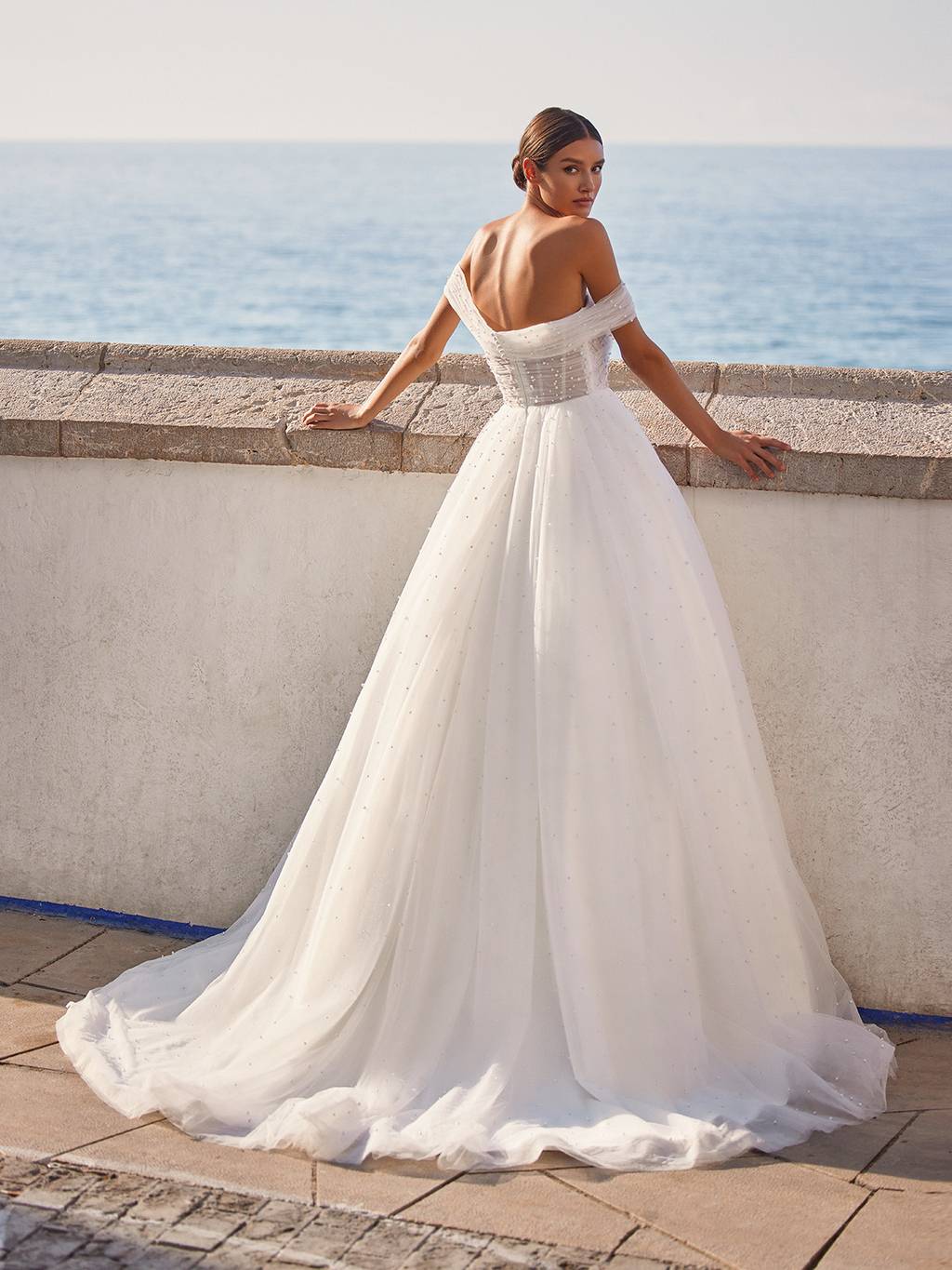 A breathtaking wedding dress truly designed for the queen in us all. This dreamy ball gown flows from the natural waist with layers of wispy tulle and dotted throughout the skirt and through its charming sweep train are glistening pearls that catch the light with your every move.Make an effortless transformation with a detachable off-the-shoulder jacket constructed with more airy ruched tulle and matching pearls.